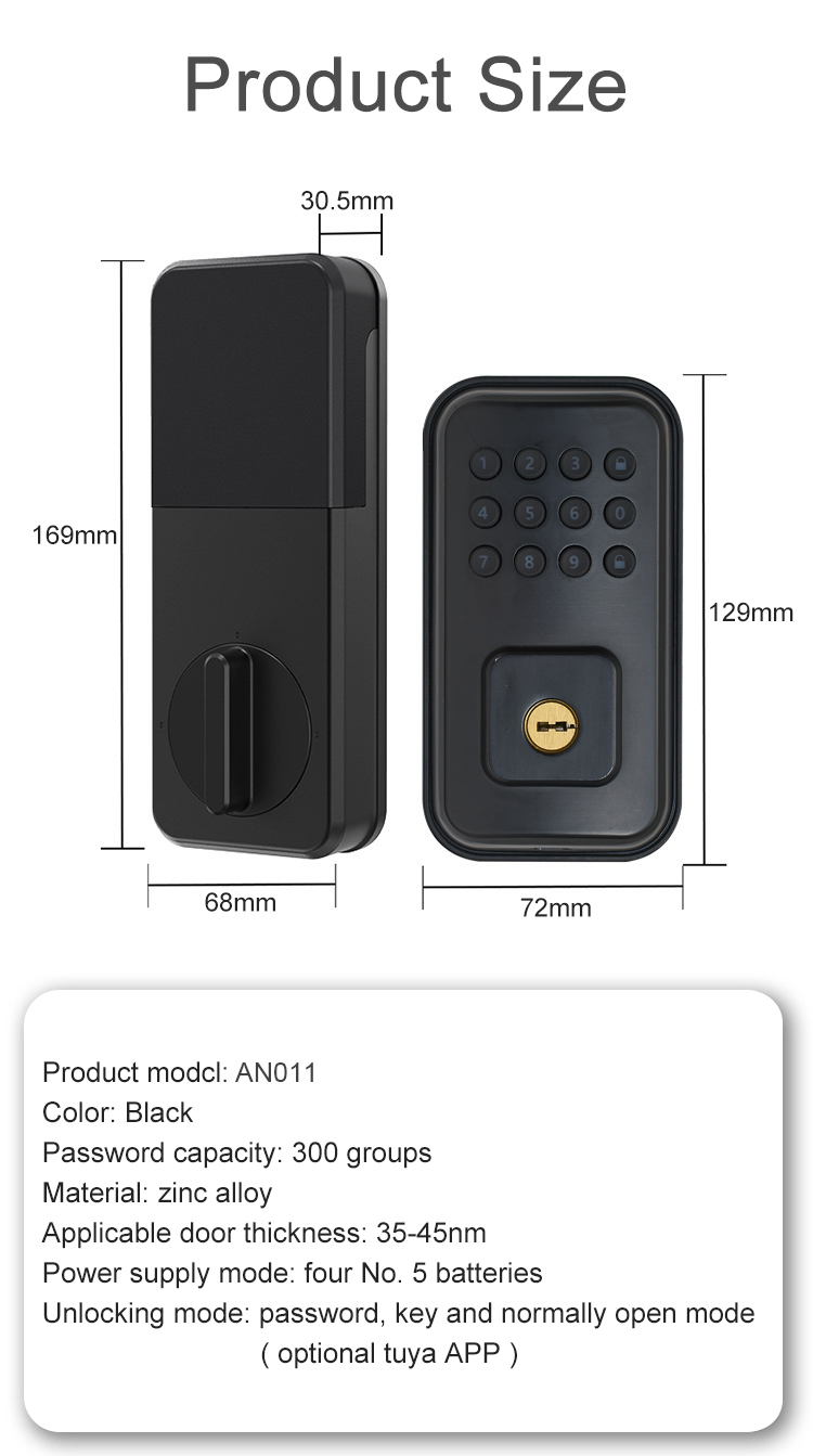 Feature: 1.Model Number:AN011 2.Material:Zinc alloy 3.Unlock way:Password +Key(APP)
